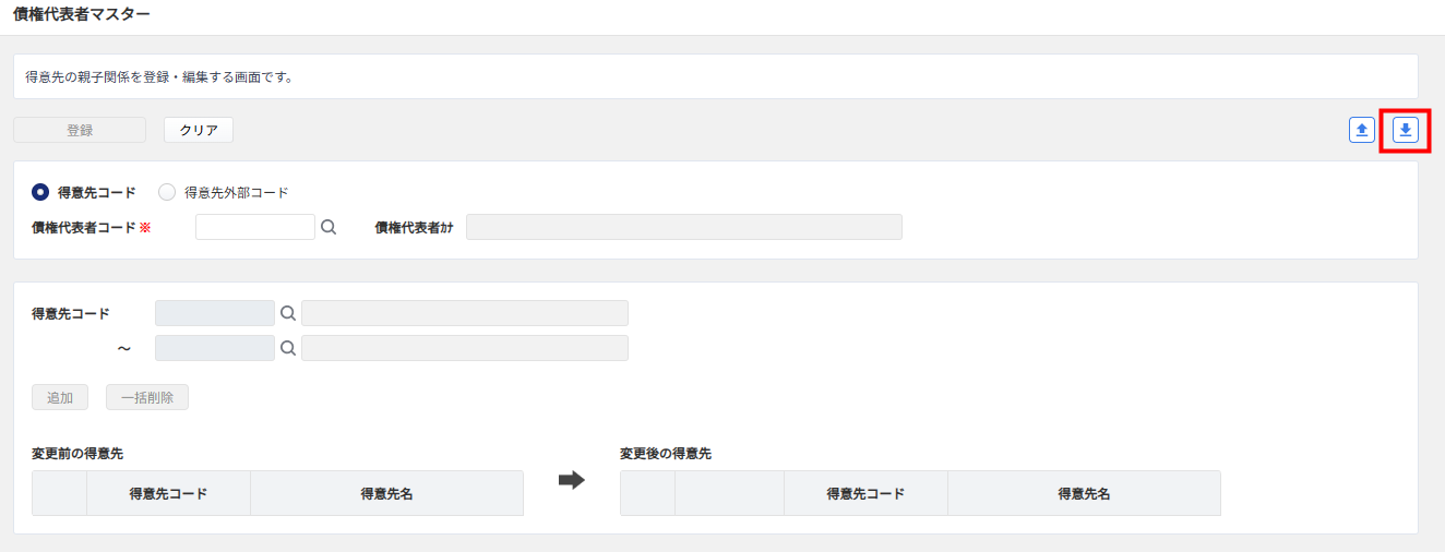 - 「マスター」>「債権代表者マスター」画面右上にあるダウンロードのアイコンをクリックし、CSVファイルのテンプレートをダウンロードします。