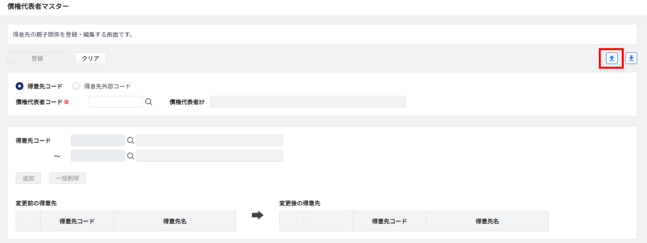 - 「マスター」>「債権代表者マスター」画面右上にあるインポートのアイコンをクリックします。