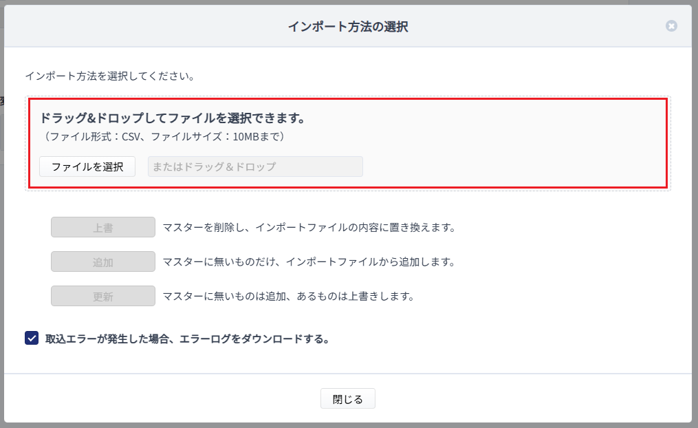 | 上書 | 現在のデータをすべて削除し、CSVファイルの内容で上書きできます。 データを総入れ替えしたい場合に使用します。 |