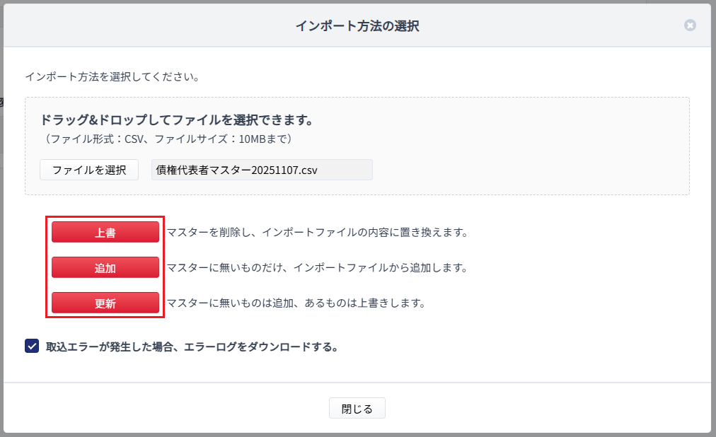 債権代表者マスターの取り込みでは、インポート方法を選択できます。