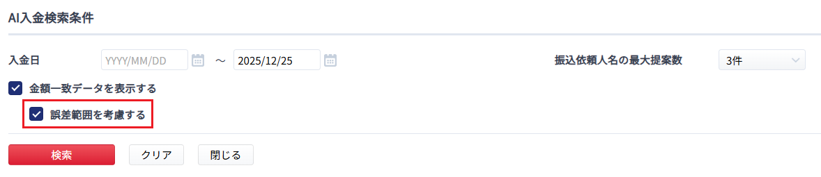 「個別消込」画面の「AI検索条件」欄で「誤差範囲を考慮する」にチェックを入れた場合における、手数料誤差範囲を考慮する検索対象を変更しました。