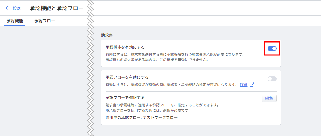 • 承認待ちの請求書がある場合、「承認機能を有効にする」を無効にすることはできません。