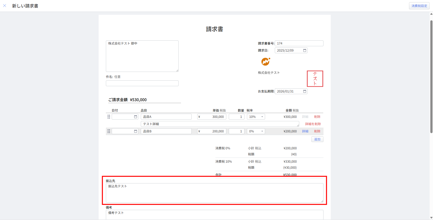 請求書を「Salesforce」インポートやCSVインポートで作成する場合も、「振込先」は400字まで入力できます。
