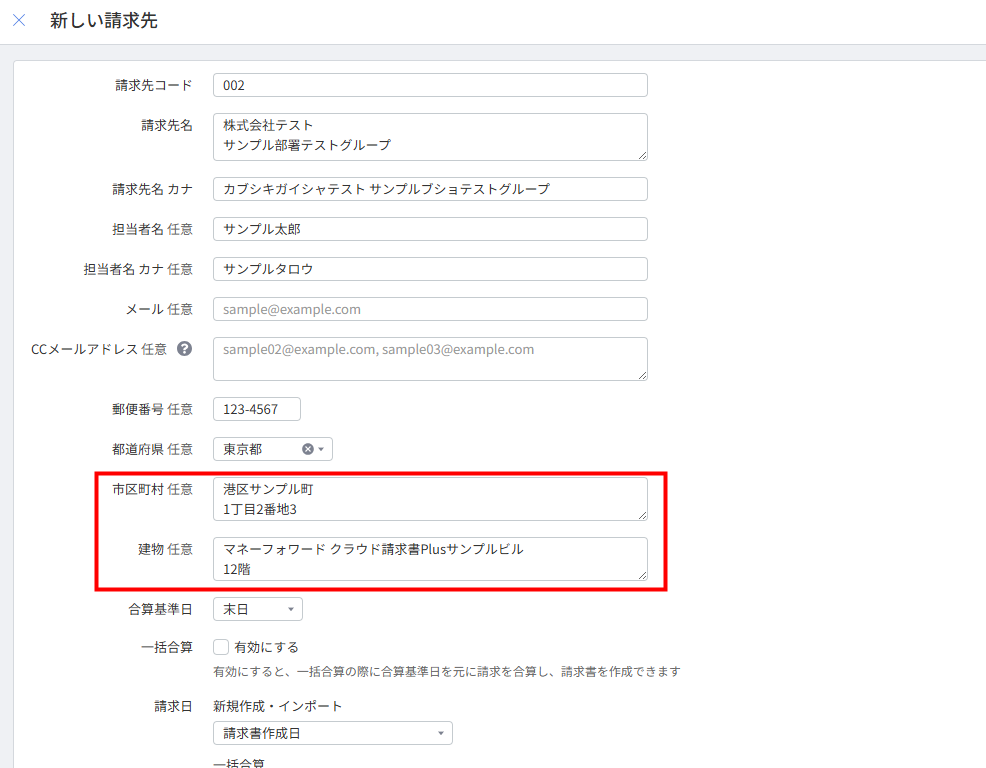 請求先の登録・編集画面の「市町村」と「建物名」において、任意の箇所で改行できるようになりました。