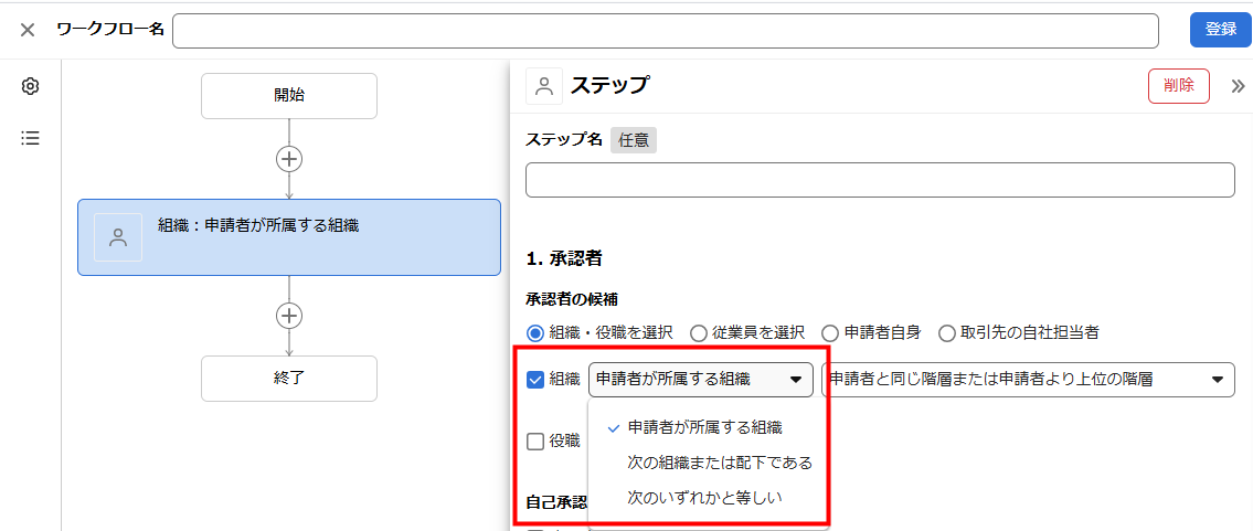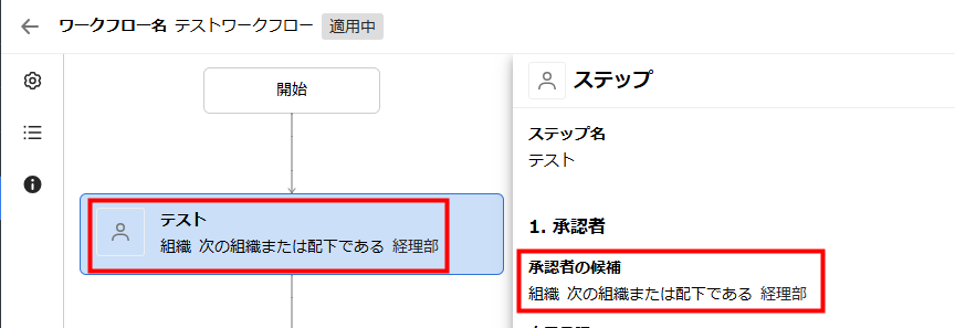 本項では、「承認者の候補」の「組織・役職を選択」において、「次の組織または配下である」を選択した場合の具体例を説明します。