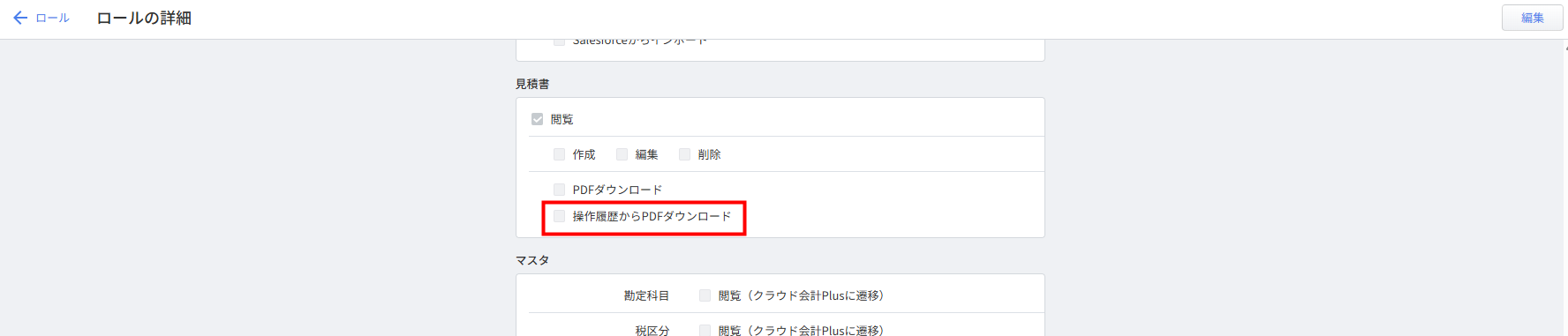 「ロールの詳細」画面の「見積書」に新たに「操作履歴からPDFダウンロード」権限を追加しました。