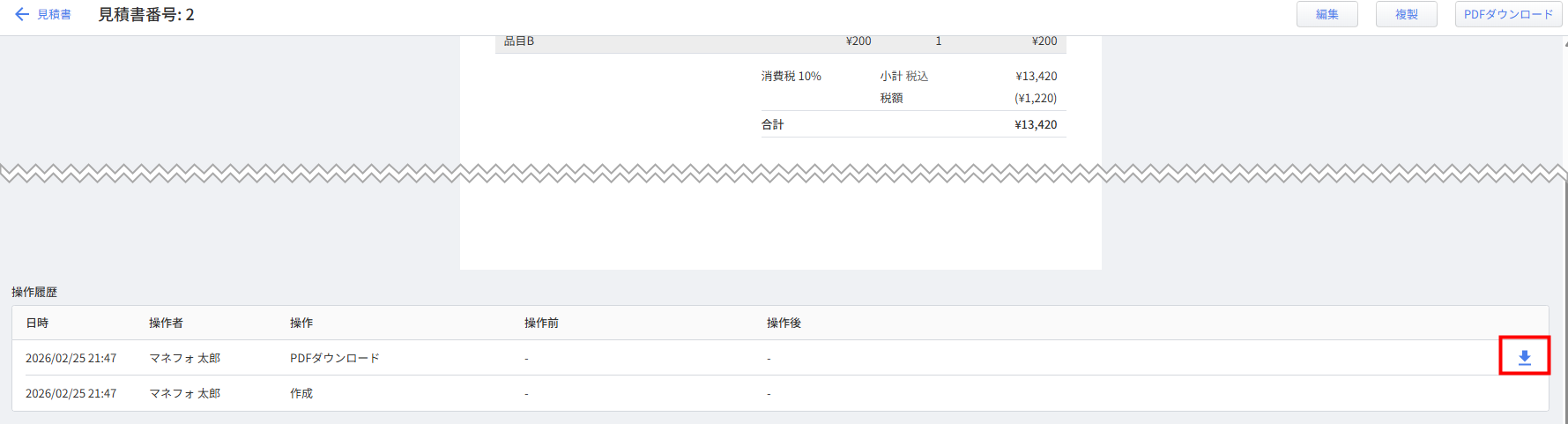 「操作履歴からPDFダウンロード」権限にチェックが入っているロールが設定されている従業員は、「操作履歴」から過去にPDFダウンロードを行った時点の見積書をPDFダウンロードできます。