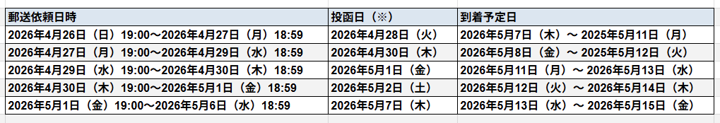 ※「投函日」は、郵送代行会社から発送が行われる日付です。