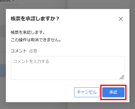 - 「申請を承認しますか?」画面を確認し、問題がなければ「承認」をクリックします。必要によりコメントを残すことも可能です。