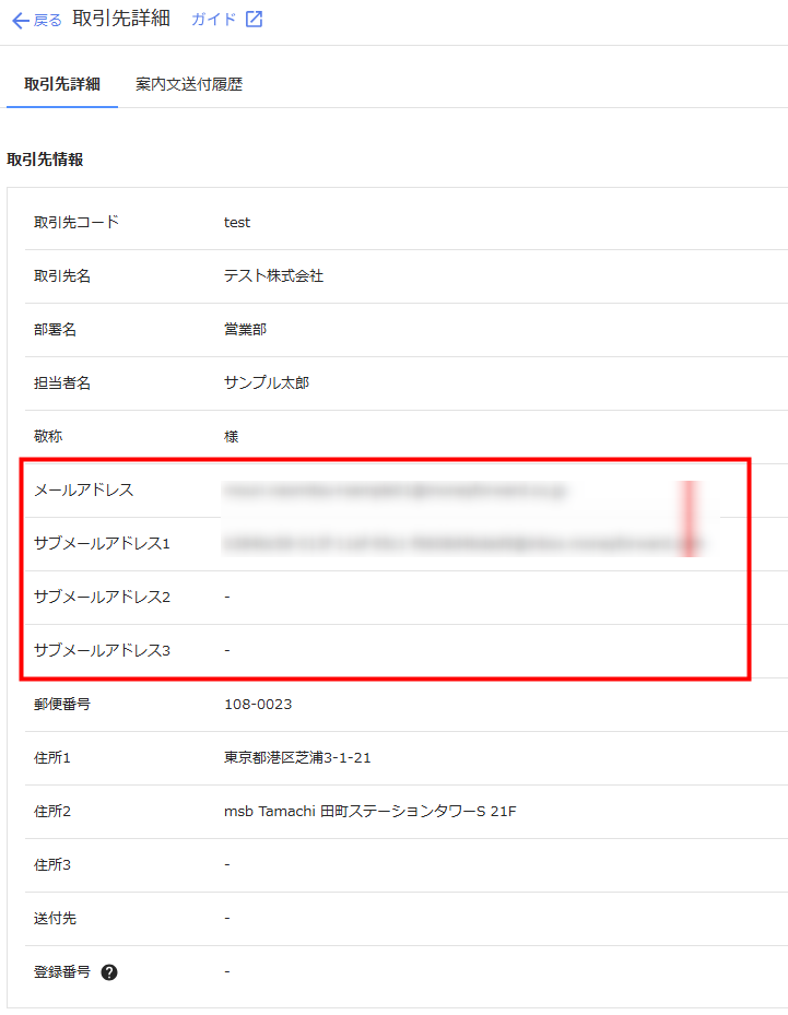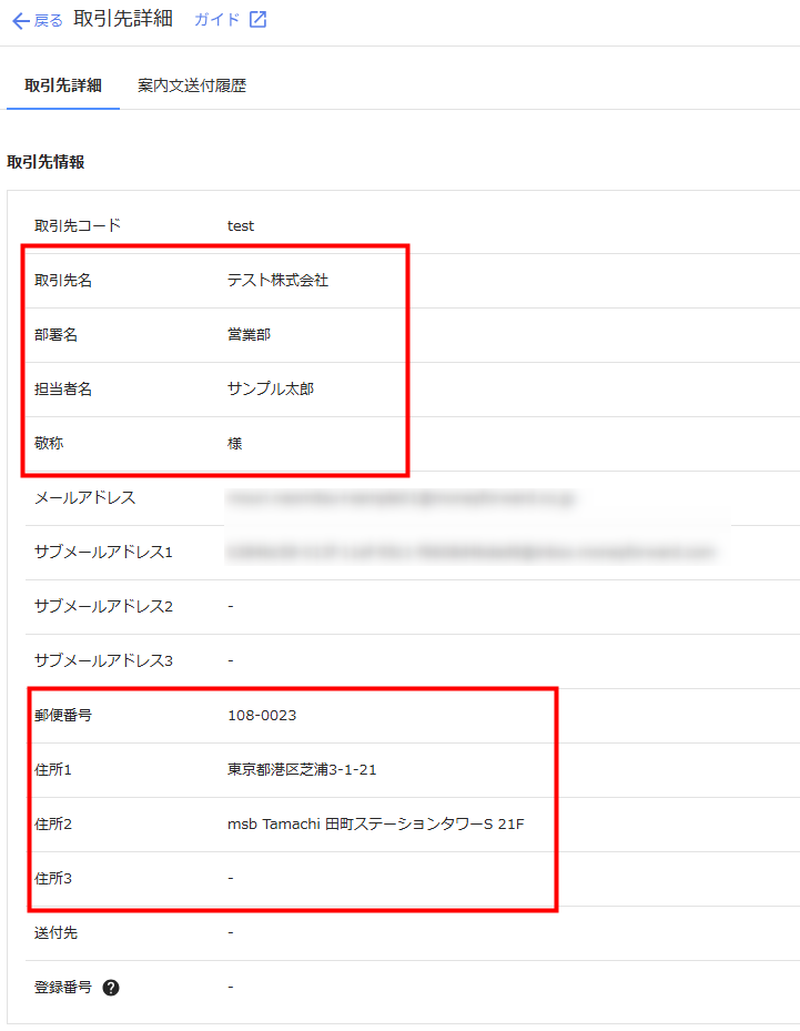 取引先の送付方法が「郵送」の場合は、該当取引先の「取引先詳細」画面で「取引先情報」に登録されている以下の情報を参照して郵送します。