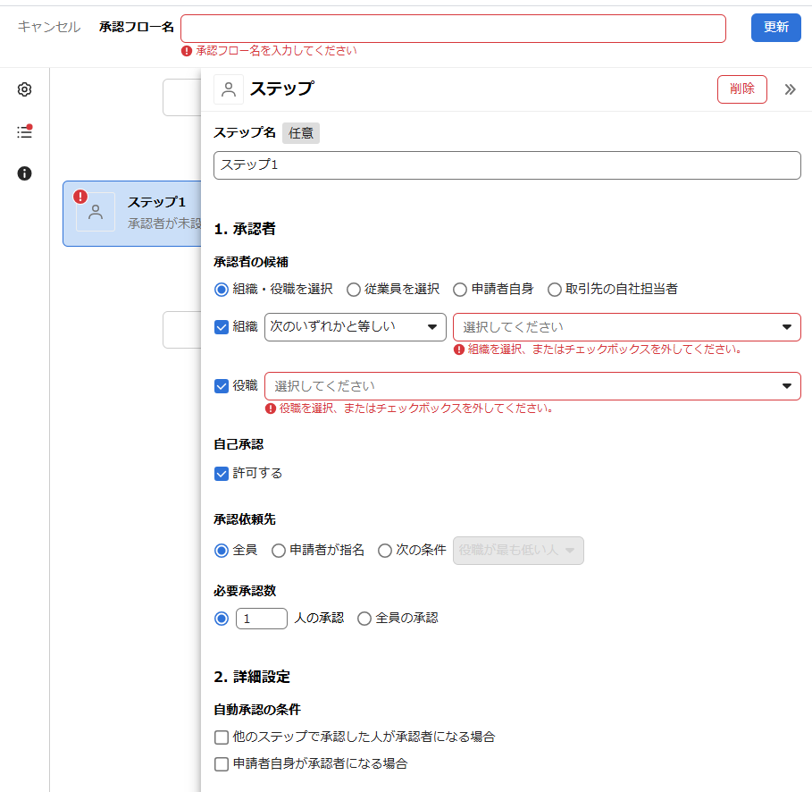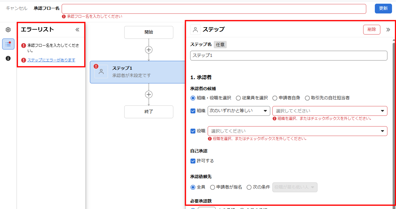 登録・更新時に必要な情報が登録されていない場合、エラーリストに「承認フロー名を入力してください」や「ステップにエラーがあります」といったエラーメッセージが表示されます。