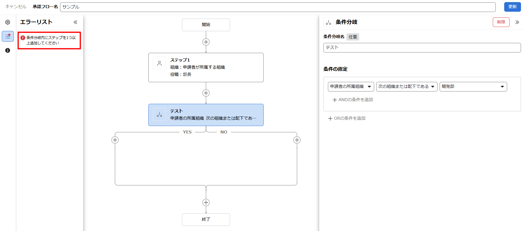 条件分岐内にステップが存在しない場合は、「条件分岐内にステップを1つ以上入力してください」というエラーメッセージが表示されます。