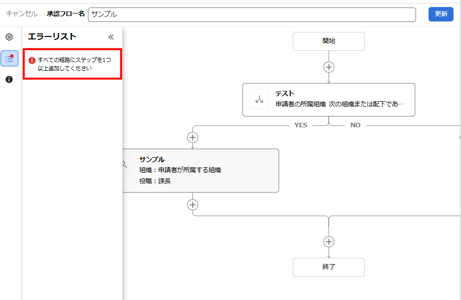 開始から終了までの経路にステップが存在しない場合は、「すべての経路にステップを1つ以上追加してください」というエラーメッセージが表示されます。