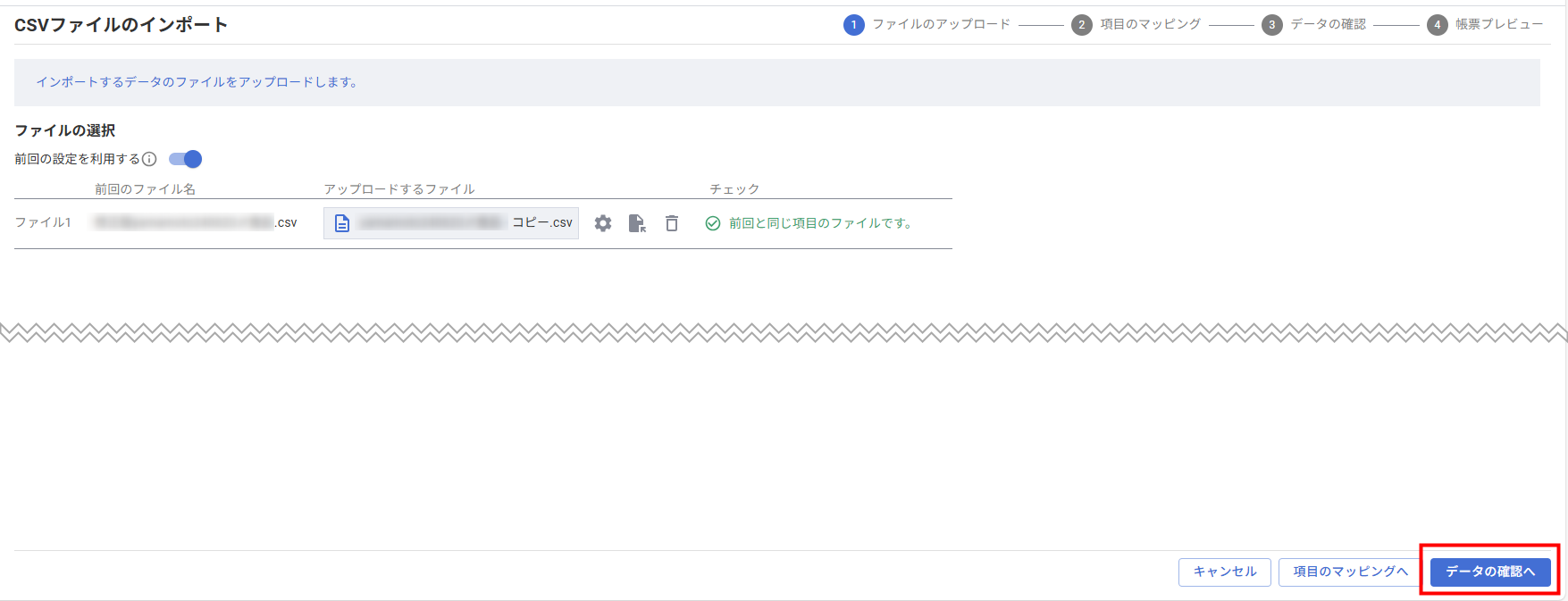 - 「CSVファイルのインポート」画面で帳票に印字する内容を入力したCSVファイルをアップロードします。