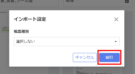 - 「インポート設定」画面で帳票種別を選択し、「続行」をクリックします。