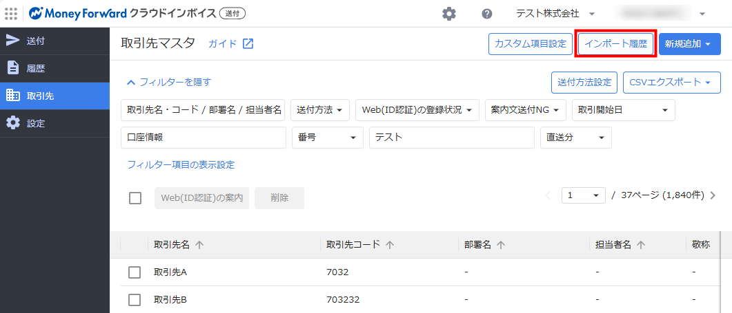 - 「取引先マスタ」画面右上の「インポート履歴」をクリックします。