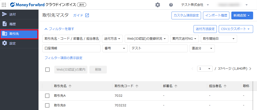 取引先の登録が完了すると、取引先ごとに請求書の送付方法を設定できます。