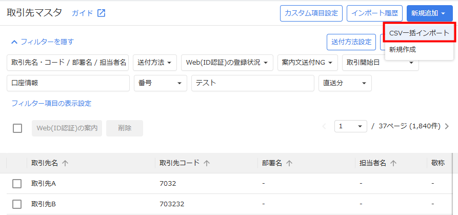 - 「取引先マスタ」画面右上の「新規追加」をクリックし、「CSV一括インポート」を選択します。