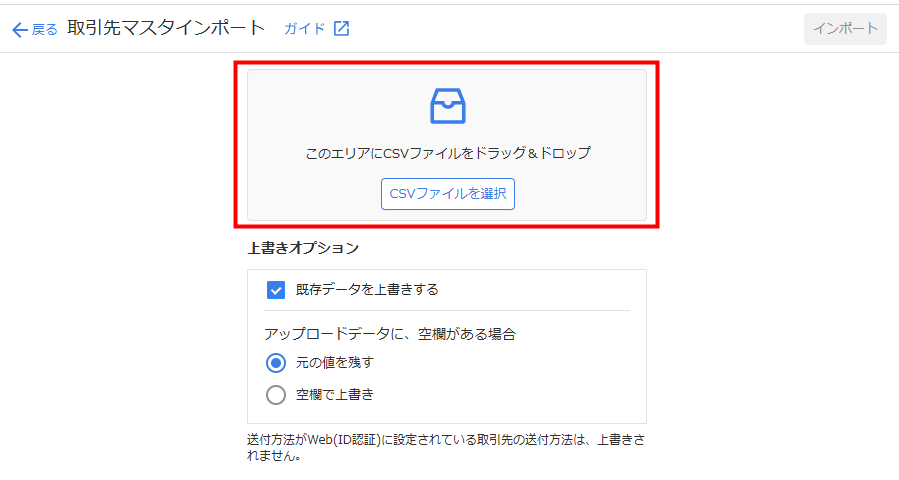 「上書きオプション」で「既存データを上書きする」にチェックを入れると、作成済みの取引先情報を上書きできます。