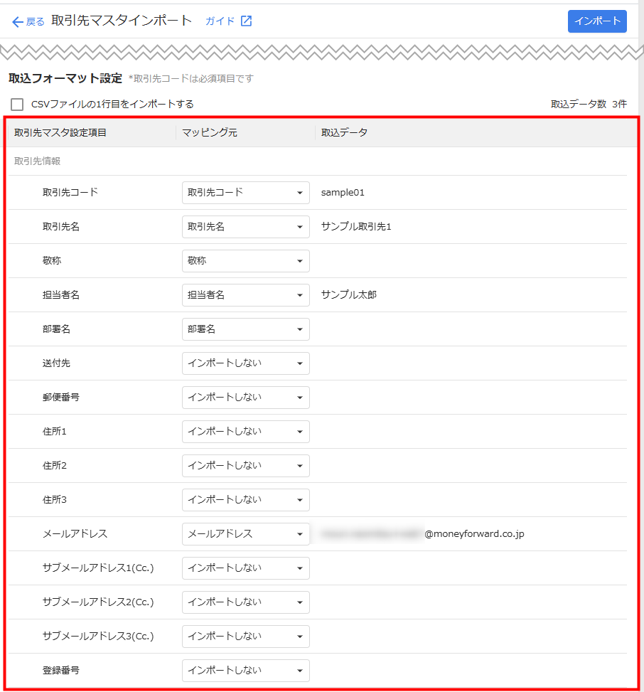 - 「取込フォーマット設定」に取引先マスタの設定項目とインポートファイルの項目行、および取込データのサンプルが表示されたことを確認します。