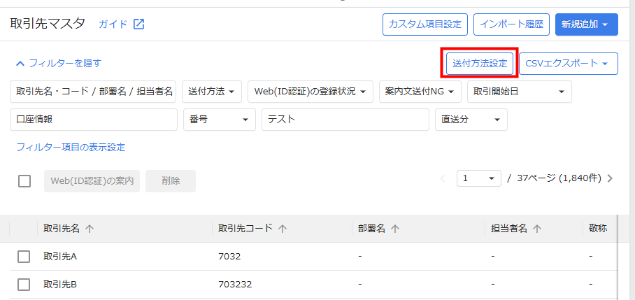 - 「取引先マスタ」画面右上の「送付方法設定」をクリックします。