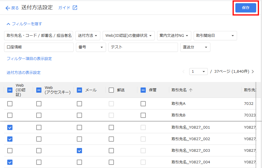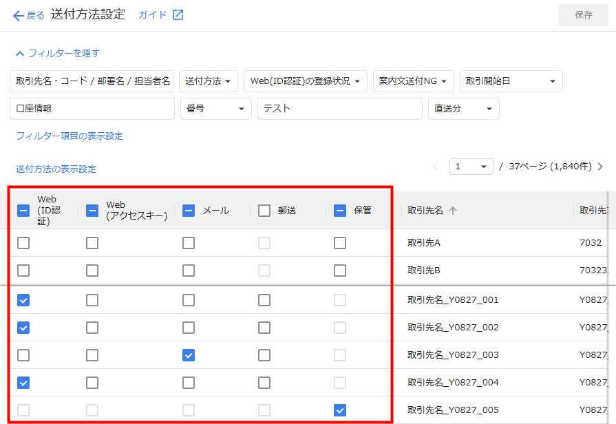 - 「送付方法設定」画面で各取引先の「Web(ID認証)」「Web(アクセスキー)」「メール」「郵送」「保管」にチェックを入れます。