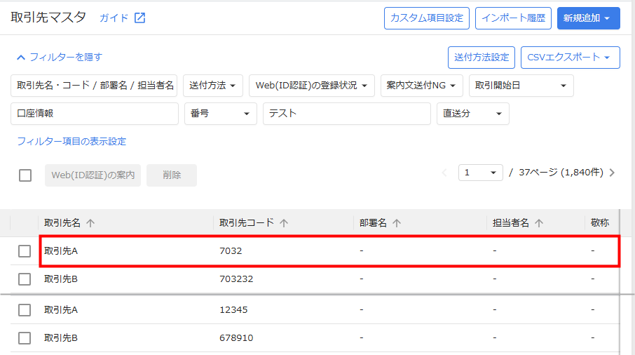 - 「取引先マスタ」画面で編集する取引先をクリックします。