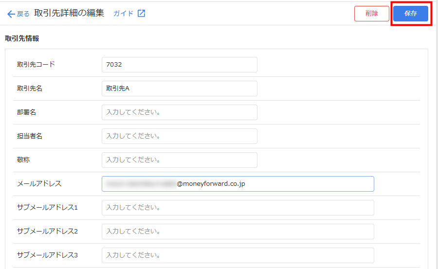 - 「取引先詳細の編集」画面で各項目を編集し、画面右上の「保存」をクリックします。