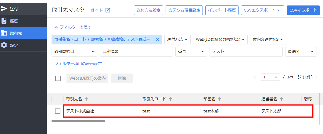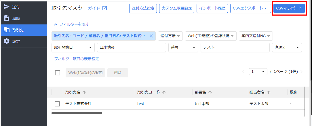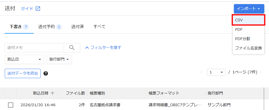 - 特定帳票の除外:インポート後に「自社送付」が「有効」な帳票を絞り込み、自社で送付する取引先の帳票を一括削除する。