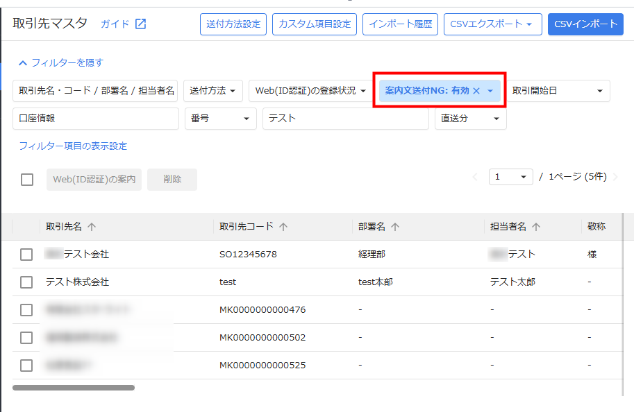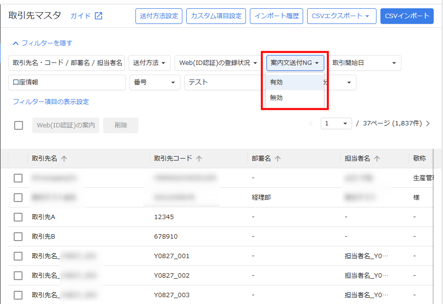 - 案内文送付時の取引先の絞り込み:「案内文送付NG」のフラグを追加し、フラグが無効の取引先だけを絞り込んで「Web送付(ID認証)」の案内文を一括送付する。