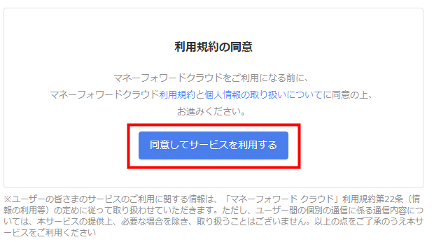 7. 「利用規約の同意」画面で「利用規約」と「個人情報の取扱について」を確認し、問題がなければ「同意してサービスを利用する」をクリックします。