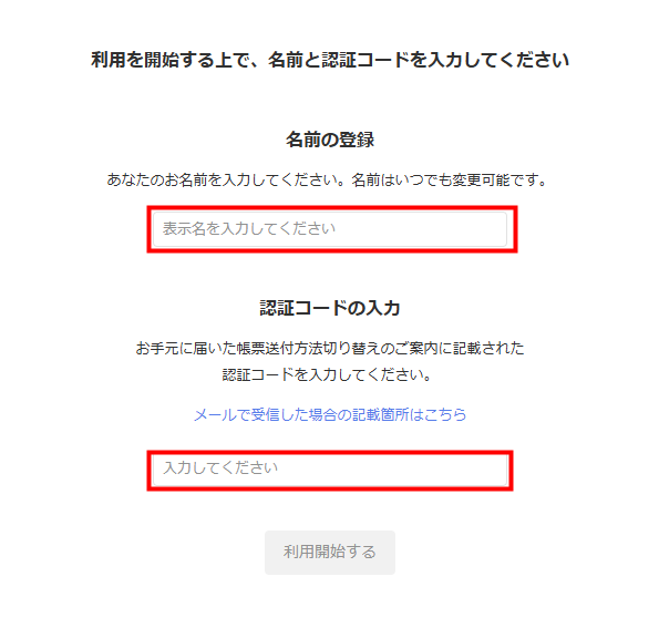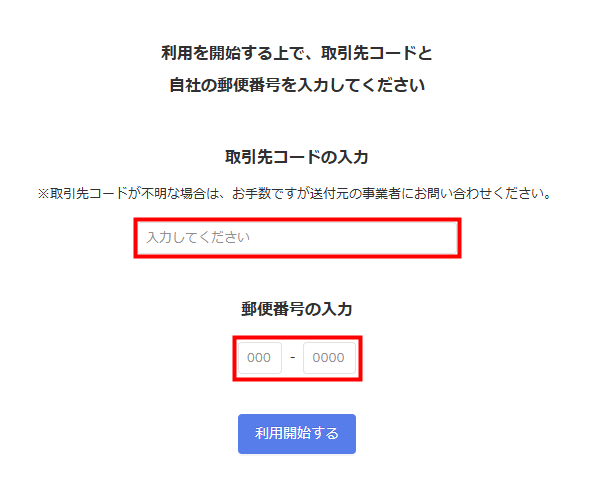 郵送「取引先コードの入力」と「郵便番号の入力」を入力し、問題がなければ「利用開始する」をクリックします。