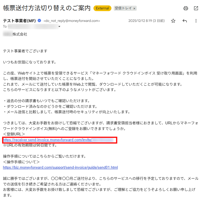 マネーフォワード クラウドインボイス 受け取り用画面に招待されたお客さま