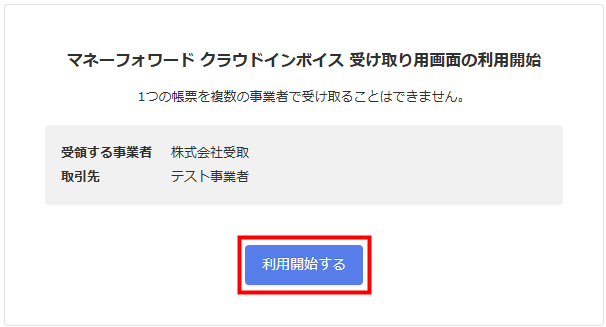 10. 「マネーフォワード クラウドインボイス 受け取り用画面の利用開始」画面で「受領する事業者」と「取引先」を確認し、問題がなければ「利用開始する」をクリックします。