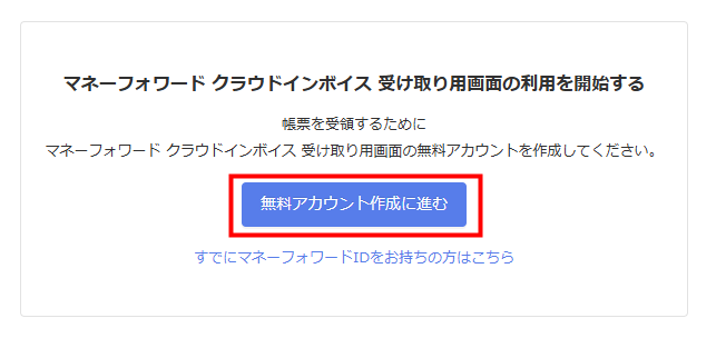 2. 「マネーフォワード クラウドインボイス 受け取り用画面の利用を開始する」画面で「無料アカウント作成に進む」をクリックします。