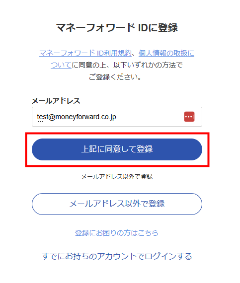 3. 「マネーフォワード IDに登録」画面の「メールアドレス」にマネーフォワード IDとして登録するメールアドレスを入力し、「上記に同意して登録」をクリックします。