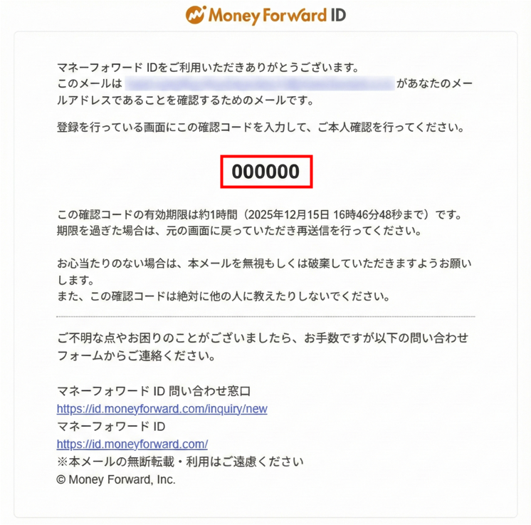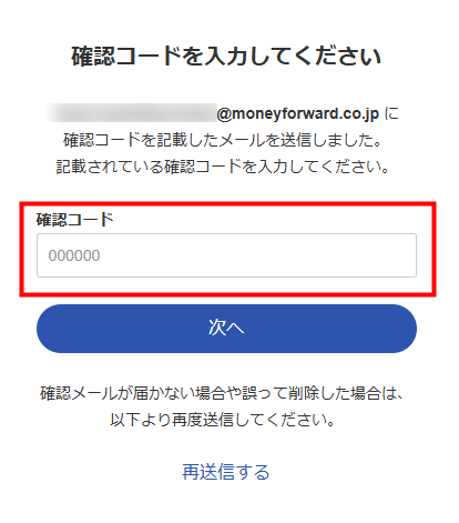 「確認コードを入力してください」画面にはマネーフォワード ID用の確認コードを入力します。