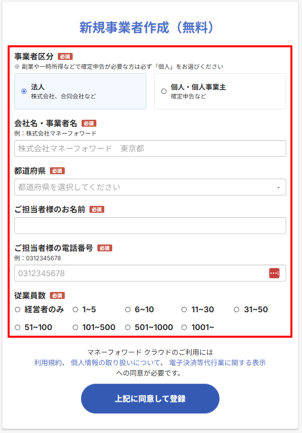 8. 「新規事業者作成(無料)」画面で各項目を入力します。