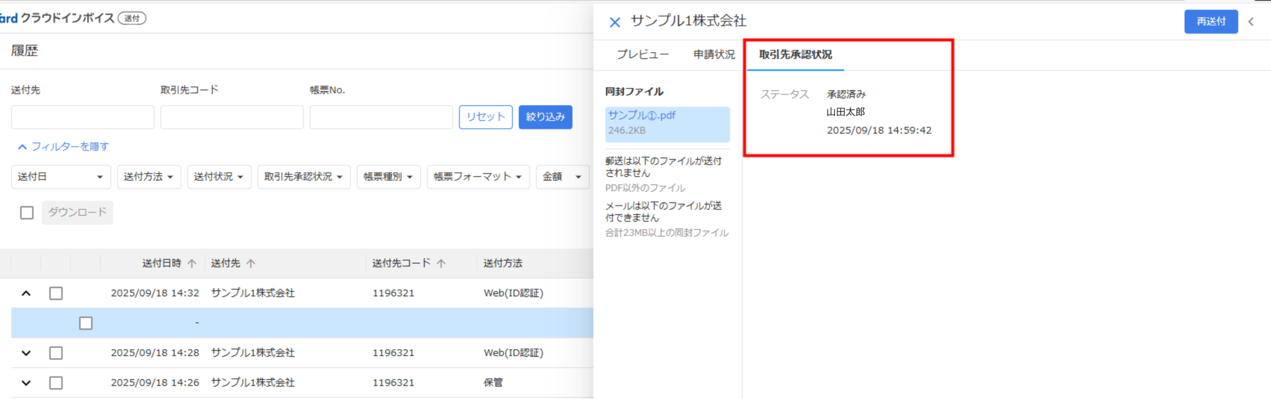 帳票をクリックすると、帳票の詳細画面にある「取引先承認状況」タブで承認者名や承認日時等を確認できます。