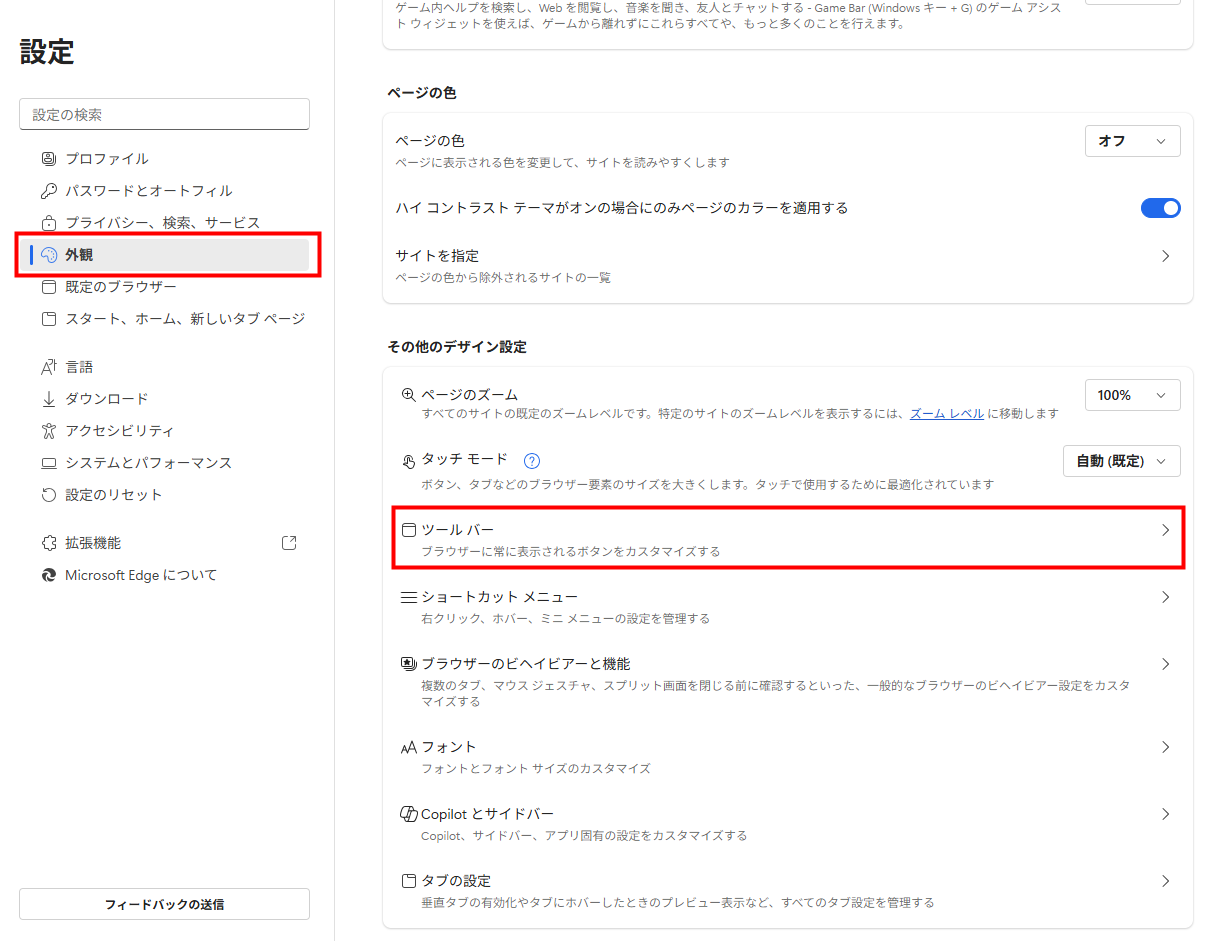 - 左メニューの「外観」をクリックし、「その他のデザイン設定」>「ツール バー」を選択します。