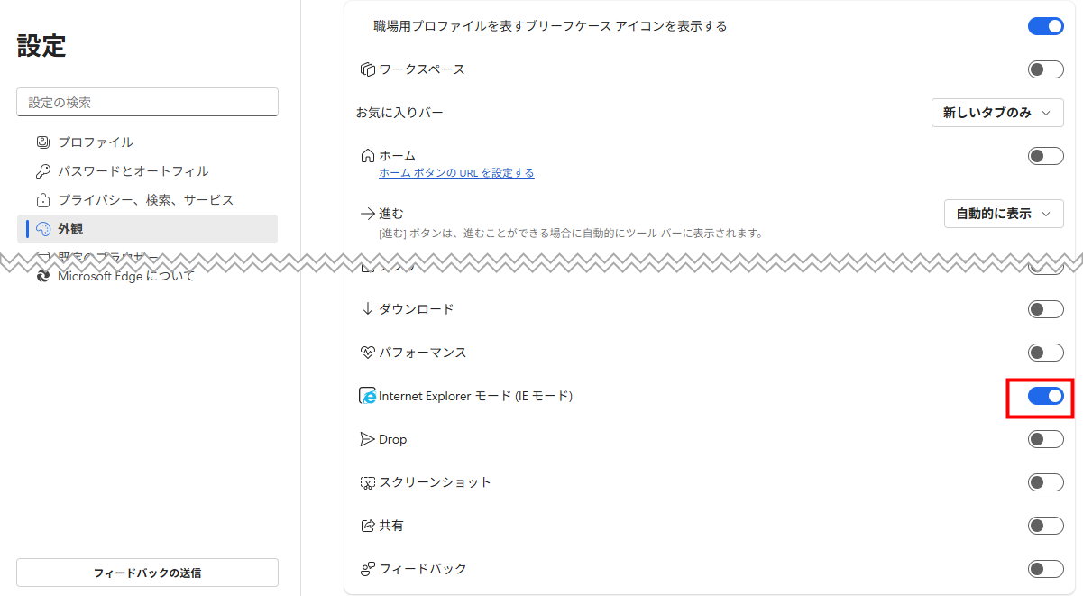 - Internet Explorer モード (IE モード)を「ON」(青色)にします。