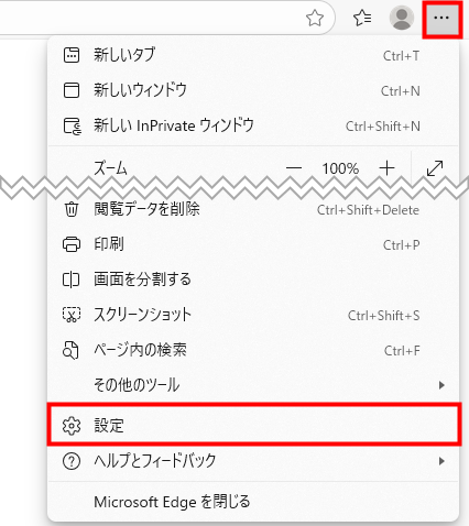 - 「Microsoft Edge」を開き、右上の三点リーダーをクリックして「設定」を選択します。