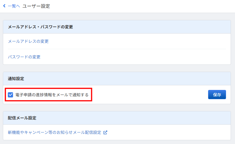2. 「ユーザー設定」画面で、「電子申請の進捗情報をメールで通知する」にチェックを入れます。