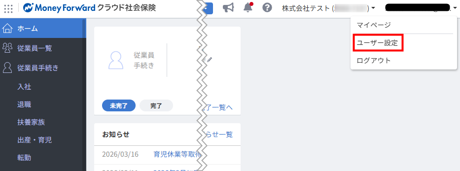 マネーフォワード クラウド社会保険では、「ユーザー設定」画面でメール通知の設定を行えます。