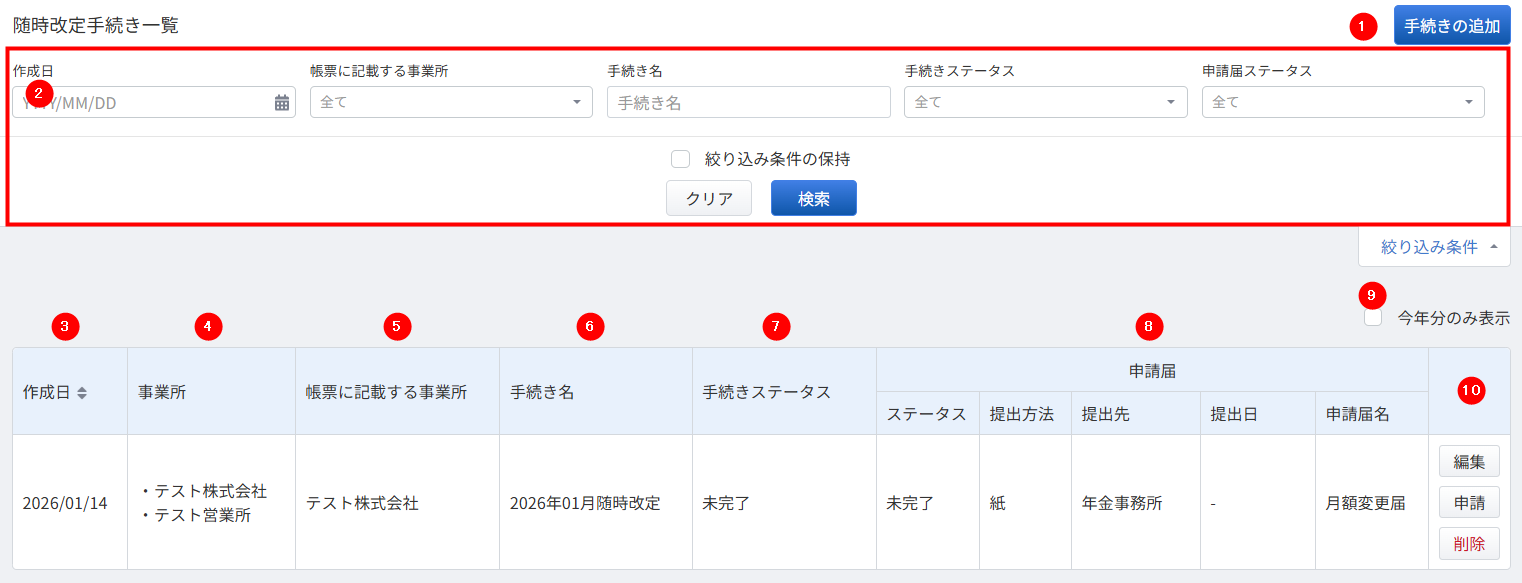 | ② | 検索条件 | 「作成日」「事業所」「手続き名」「手続きステータス」「申請届ステータス」を指定し、従業員を絞り込み検索できます。 |