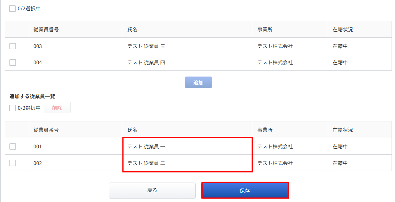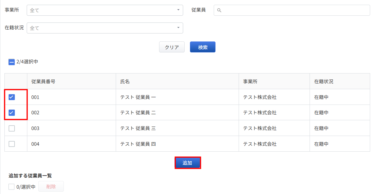 - 「追加する従業員一覧」に随時改定を行う従業員が表示されたら、画面最下部の「追加」をクリックします。
