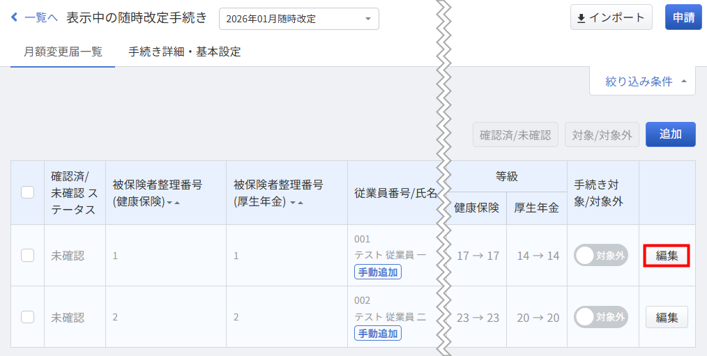 「随時改定手続き一覧」画面では、「月額変更届」の追加や編集を行うことができます。