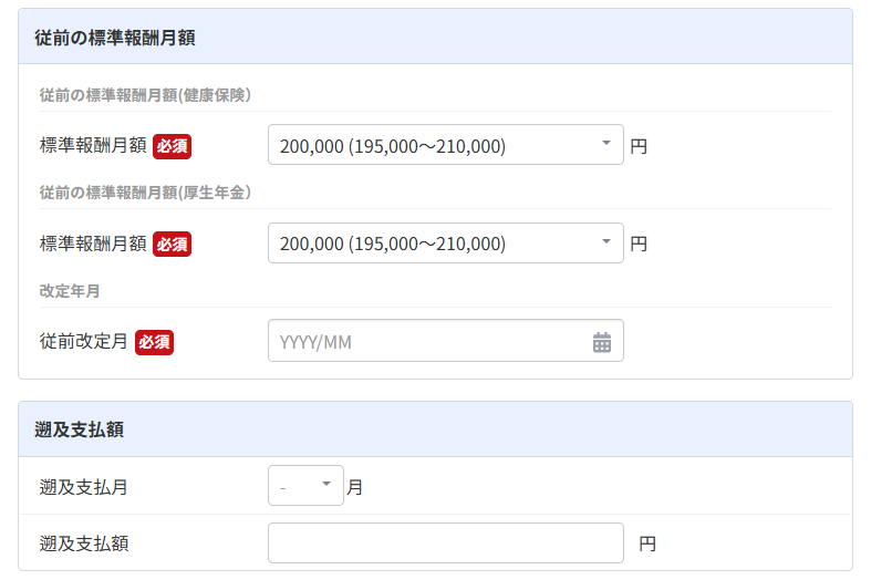 「従前の標準報酬月額」「遡及支払額」では、標準報酬月額や従前仮定月の閲覧や編集が行えます。