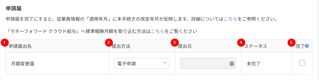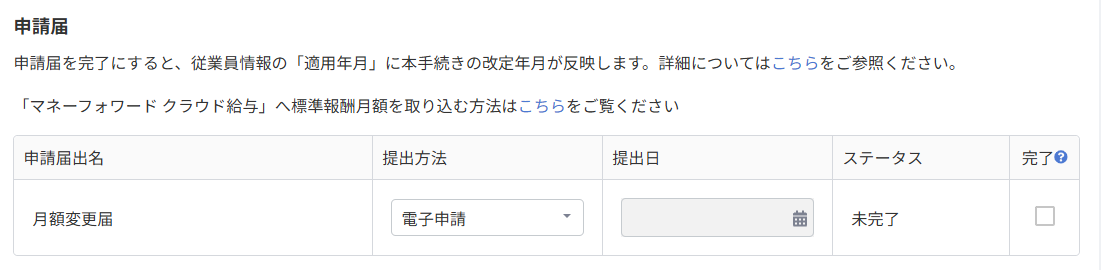 申請届の提出方法を選択したり、ステータスを完了に変更することができます。