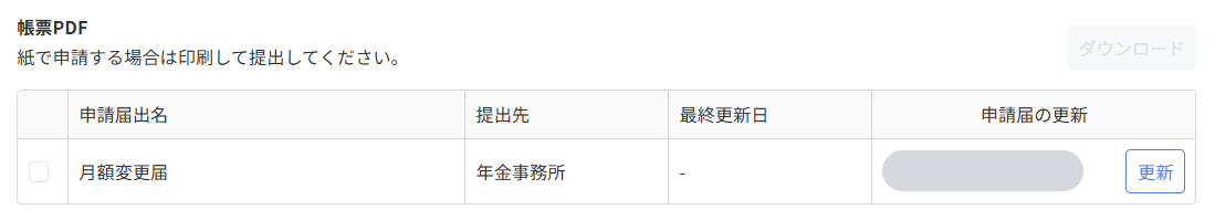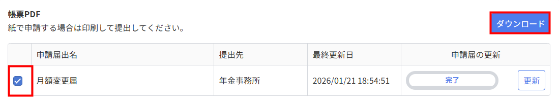 「申請届の更新」が「完了」になると、「ダウンロード」をクリックして帳票を確認できます。